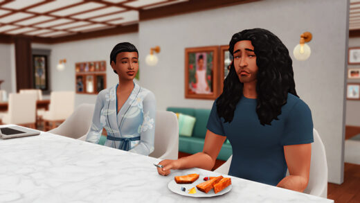 I quickly downed my tea, hoping to gain some liquid courage. For what? I don’t know… Not act like a fool around him? When he finished his noodles, we sat off to the side to talk and be around fewer sims. His twin sister, Diamond, is my friend too. I don’t think Mommy likes her very much. They’re both living at home for now. She’s not working, but Devonte said he’s got a job with the Sulani conservation team. How fancy! He’s trying to save up to move out soon, so he has a part-time job in shipping and receiving. I wasn’t quite sure what that involves, but it’s cool that he’s so committed to his goal.